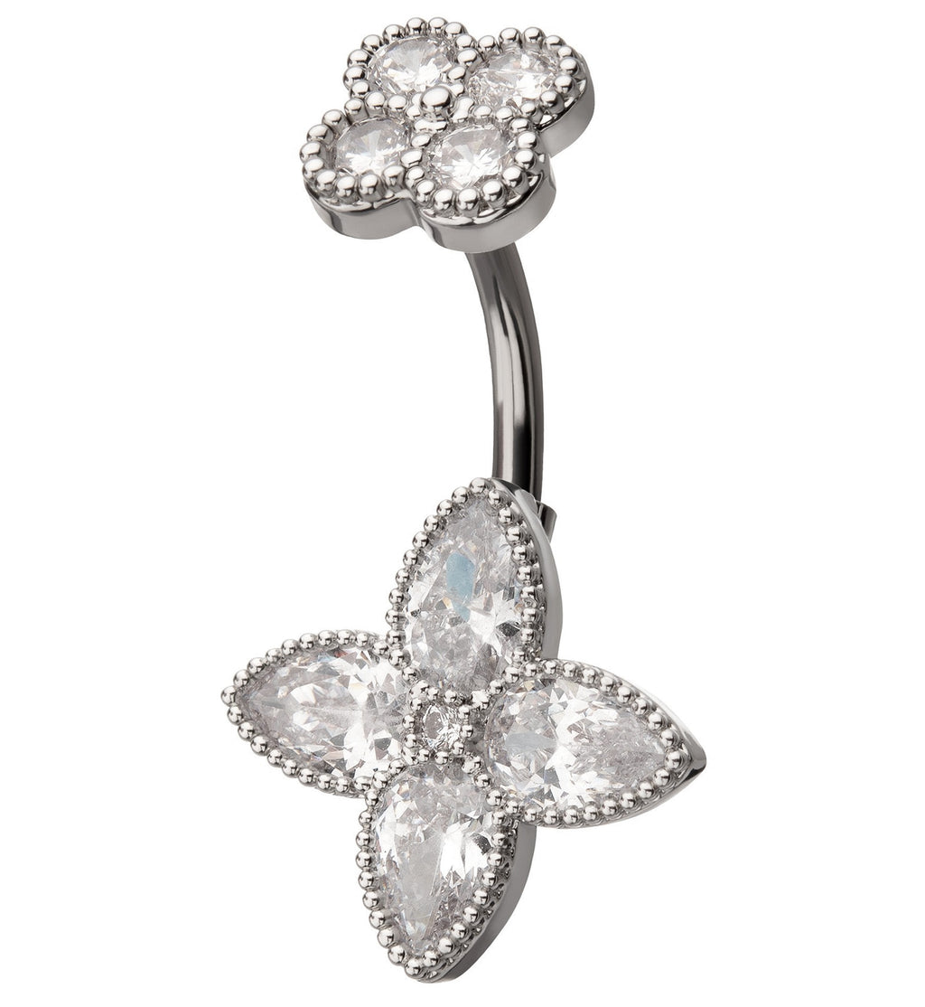 Beautiful belly button ring has a four petal flower design that is made from teardrop clear cz gems and has a beaded outline. The belly ring has a wearable length of 7/16" (11mm) and a gauge size of 14G. Made from 316L stainless steel. It has a four clear cz gem design on top that has a beaded outline. The top design measures about 8mm x 8mm and the bottom design measures about 17mm x 17mm. For healed piercings. Sold individually.