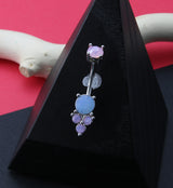 This beautiful belly ring is made with 316L stainless steel and several synthetic opal gems. One pink opalite is on top of the barbell and three pink opalite gems line the bottom of a blue opalite on the bottom of the barbell. Barbell size is 14G with a 7/16" (11mm) length. Externally threaded. For healed piercings.