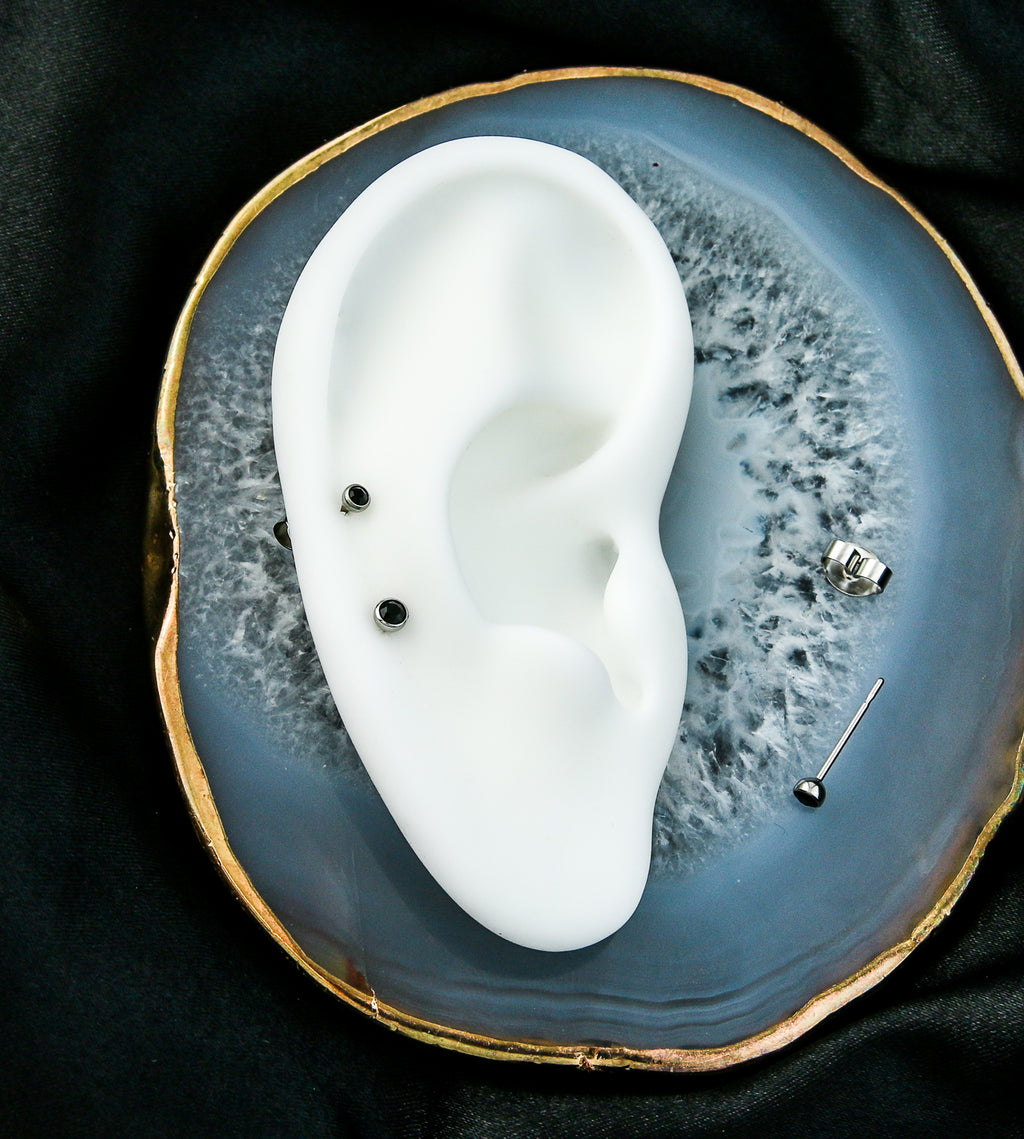 Stud earrings with a bezel set black cz gem on top. Made with surgical 316L stainless steel. Size is 20G with a length of about 5/16" (8mm). Multiple gem sizes available: 2.5mm and 3mm. Each piece has a stud design with a butterfly back. Sold in pairs (2pcs).