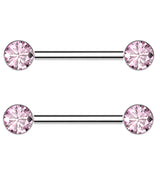 Pretty, threadless titanium nipple barbells with double, bezel-set, pink cz gem ends that are about 5mm in size and have a convex back. Made with durable ASTM F-136 Implant grade titanium and available in size 14G (1.6mm) with a 9/16" (14mm) length. Sold in pairs (2pcs).