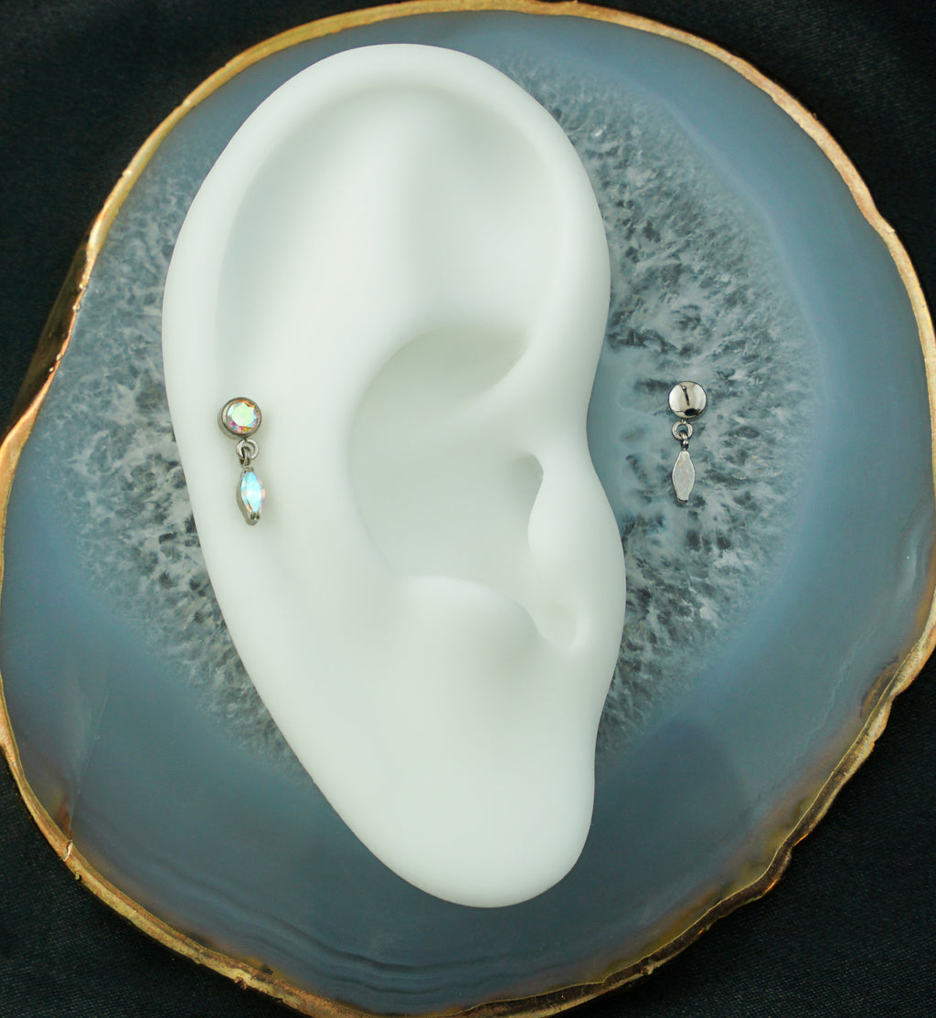 Made with durable ASTM F-136 titanium, this threadless top piece has a bezel-set, 3mm rainbow aurora cz gem with an attached, dangling, 4mm, marquise-shaped, rainbow aurora cz gem. Full design measures about 11.4mm x 3.5mm. This top has a threadless design and fits most threadless posts. Sold individually.