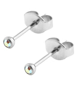 Colorful, stud earrings with a bezel set rainbow aurora cz gem on top. Made with surgical 316L stainless steel. Size is 20G with a length of about 5/16" (8mm). Multiple gem sizes available: 2.5mm, 3mm, 4mm. Each piece has a stud design with a butterfly back. Sold in pairs (2pcs).