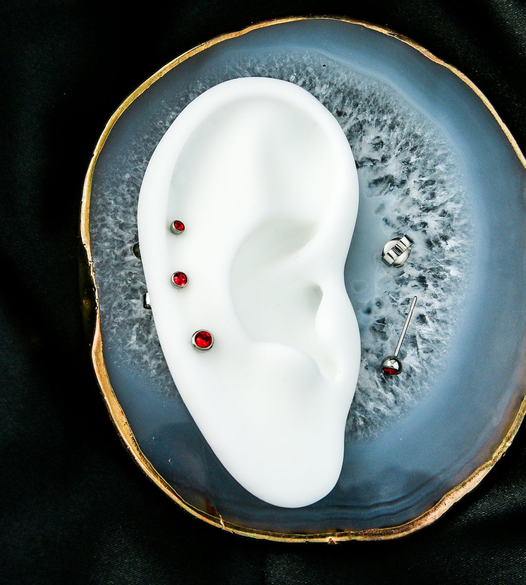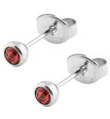 Lovely, stud earrings with a bezel set red cz gem on top. Made with surgical 316L stainless steel. Size is 20G with a length of about 5/16" (8mm). Multiple gem sizes available: 2.5mm, 3mm, 4mm. Each piece has a stud design with a butterfly back. Sold in pairs (2pcs).