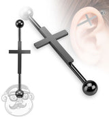 Show off your inner darkness with our black cross industrial barbell! The 14g barbell is constructed from 316L stainless steel with black PVD coating and external threading for simple wear. Central black cross pendant adds straightforward style to mystical & magical looks! Choose your desired length with the drop-down menu below.