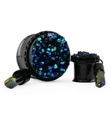 Sold in pairs (2pc). Black pvd on 316L stainless steel. Double flares. 1/2" - 1 inch. Synthetic rainbow druzy stone. Pattern & color will be unique for each plug. Wearable area: 10mm - 11mm.