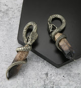 Handcrafted white brass ear weights with a cobra snake design wrapped around a black flame petrified palm root piece. Height: 80mm, width: 26mm. Height and width are approximate as these are handcrafted. Size is 2G (6mm) with an approximate weight of 35 grams each. Sold in pairs (2pcs).