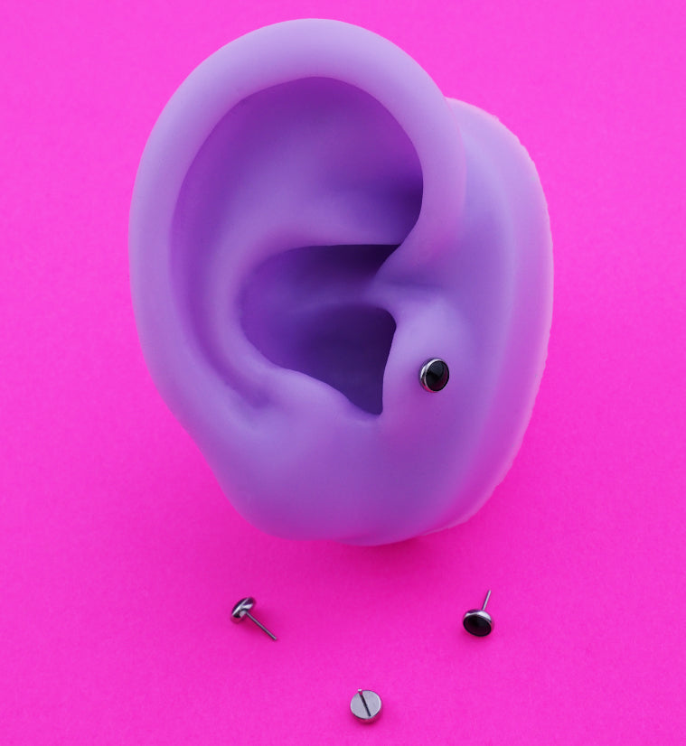 Threadless top piece that has a black onyx stone in round, bezel set. Fits all threadless posts. Made from ASTM F-136 titanium with a 316L stainless steel pin. Length is approximately 5mm. Top size: 4mm. Sold individually (1pc, top only).