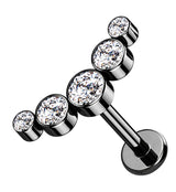 Black labret post made from black pvd on 316L stainless steel with an arch of sparkling, clear cz gems. Size is 16G with an inner length of either 1/4" (6mm) or 5/16" (8mm). 3mm disk size. Top is approximately 12mm. Internally threaded. Sold individually (1pc). For healed piercings.