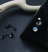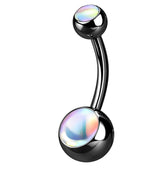 Classic black colored belly ring with beautiful, iridescent, aura inlays on top and bottom. The 316L stainless steel barbell is 14G with a 3/8" (10mm) length. Externally threaded. For healed piercings.