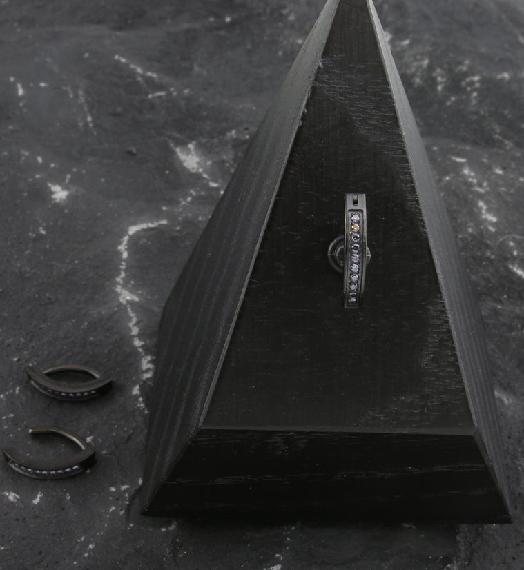 Pretty belly button ring with a hinged design that showcases a sleek bar design with a line of black aurora cz gems going down the middle. Size is 14G with a 3/8" (10mm) barbell length. It is made from black pvd on 316L stainless steel with a hinged design. The hinged design makes this piece easy to insert and click closed. Sold individually (1 pc).
