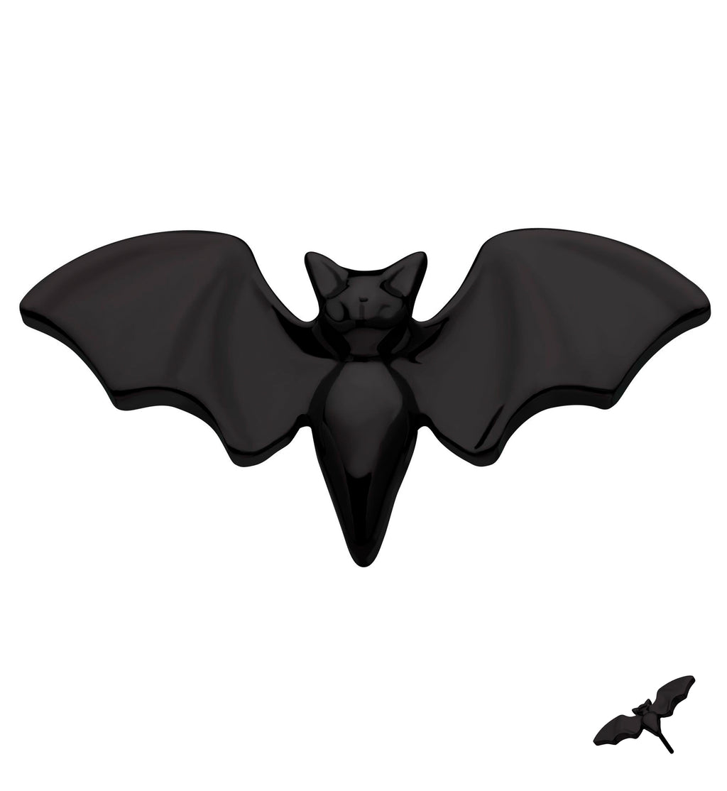 Made from black pvd on ASTM F-136 titanium, this titanium threadless top has a flying bat shape. The design size is about 11.9mm x 5.8mm. This top has a threadless design and fits most threadless posts for a secure fit. Sold individually.