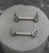 Nipple barbells with a black bat wing shape on either side. Made from 316L stainless steel - bat wings are black pvd. Size is 14G with a barbell length of 9/16" (14mm). Externally threaded. Bat wings are about 10mm x 4mm in size each. Intended for healed piercings. Sold in pairs (2 pcs).