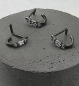 Striking piece for your nose piercing! This curved nose ring is filled with clear cz gems in both a round and marquise shape. Made from black pvd on 316L stainless steel. Size is 18G. Length is 5/16" (8mm). Sold individually (1 pc).