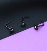 Black PVD Beaded Flower Clear CZ L Bend Nose Stud