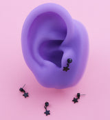This titanium top is sold individually and made from the black pvd on ASTM F-136 titanium with a bezel set 2mm black aurora cz gem with a dangling star attached. Star measures about 4mm in size. Top is designed to fit most threadless posts with a 25G pin. Cool style to add to your piercing!