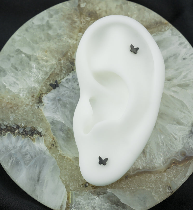 Threadless top piece that has a butterfly design that has rounded edges, making it look like a bubble butterfly shape. Made from black pvd on durable ASTM F-136 titanium. The top design measures 4mm. Top piece for your cartilage or tragus piercing! Sold individually.