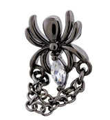 Barbell with a spider shape attached to an oval clear cz and dangling, double chain detail. Made from black pvd on 316L stainless steel and externally threaded. Cool option for cartilage or tragus piercings! Size is 16G with a bar length of 1/4" (6mm). End size is 9mm x 11mm. With chain: 9mm x 16mm Sold individually. For healed piercings.