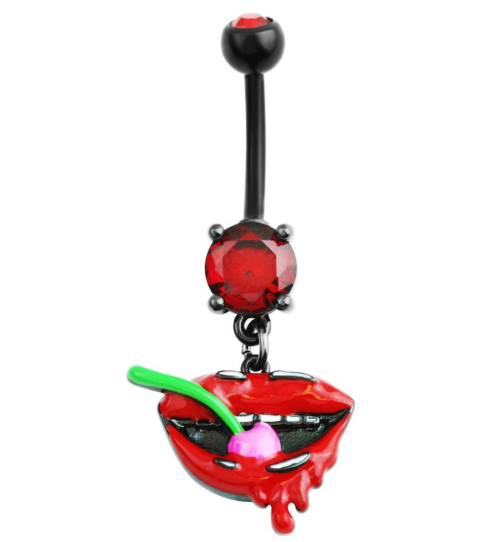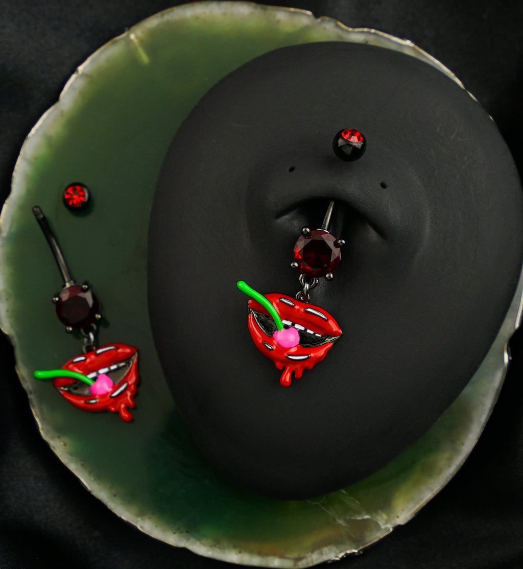 Beautiful belly button ring that has a dangling, mouth design with red lips that is biting a cherry. On top, there is a bezel set, 5mm red cz gem. On bottom, there is a prong set, red cz gem. The belly ring has a wearable area of 3/8" (10mm) and a size of 14G. Overall, the design measures 14mm x 20mm. It is made from black pvd on 316L stainless steel and is externally threaded with M1.2 threading. For healed piercings. Sold individually.
