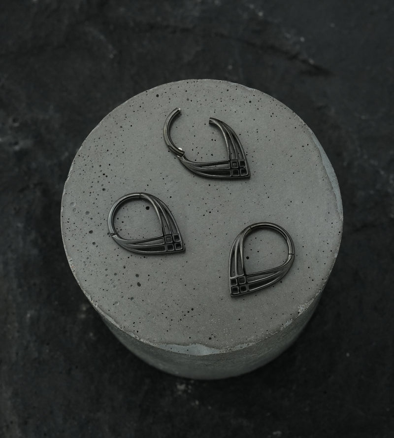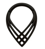 Hinged segment ring made from black pvd on 316L stainless steel with a pointed shape and crosshatch design at the bottom. Size is 16G. Inner diameter size is 5/16" (8mm). The hinged design makes this piece easy to insert and remove. Sold individually (1pc).
