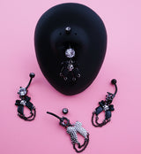 This belly button ring is an edgy choice for your navel piercing! Crafted with black pvd on 316L stainless steel and featuring dangling black bow with a skull face in the center and two connecting dangle chains. Complete with clear cz gems! This piece is designed to fit healed navel piercings and measuring 14G with a 3/8” (10mm) barbell length. Top gem measures 5mm and bottom gem measures 8mm.