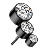 Threadless top piece that has 3 cz gems that are slightly curved and gradually get larger in size. Made from black pvd on ASTM F-136 titanium and clear cz gems. Measures about 9mm x 4mm. Fits all threadless posts (14G - 20G) . Sold individually (top piece only).