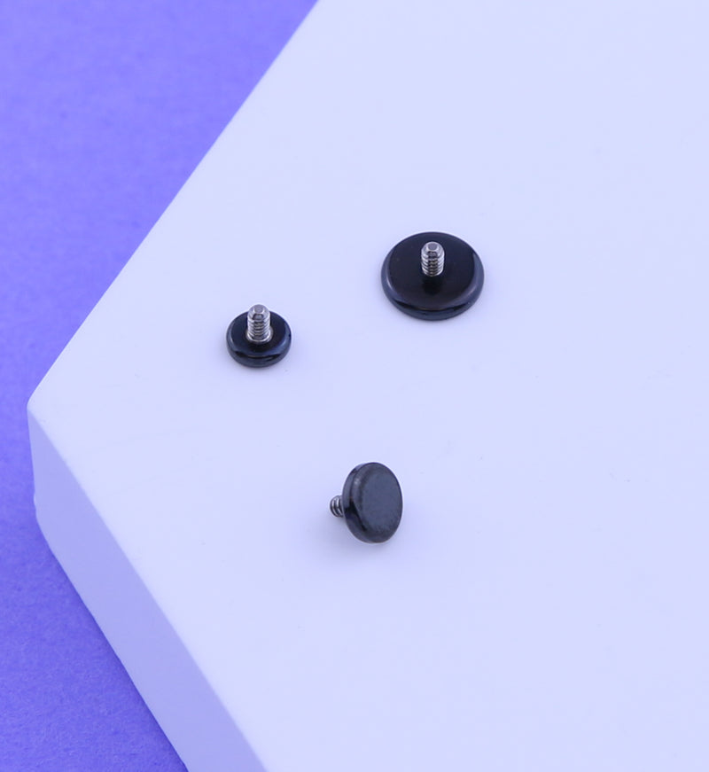 This internally threaded top features a flat disk shape. This piece is made from black pvd on ASTM F-136 titanium and is size 16G. This piece comes in 3 sizes: 2.5mm, 3mm, and 4mm. Sold individually (1pc - top only).