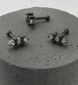 Barbell with a bar shaped end that is filled with three divided clear cz gems. Made from black pvd on 316L stainless steel and externally threaded. Shining option for cartilage or tragus piercings! Size is 16G with a bar length of 1/4" (6mm). End size is 5mm x 10mm. Sold individually. For healed piercings.