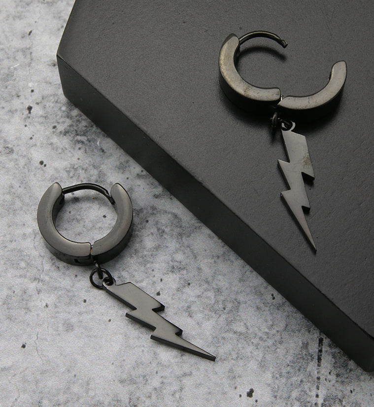 Huggie earrings with a dangling lightning bolt attached. Made from black pvd on 316 stainless steel. Size is 18G. Diameter is 3/8" (10mm). Total length is approximately 37mm. The hinged design is easy to open and close. Sold in pairs (2 pieces).