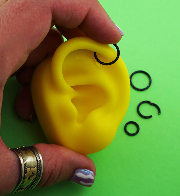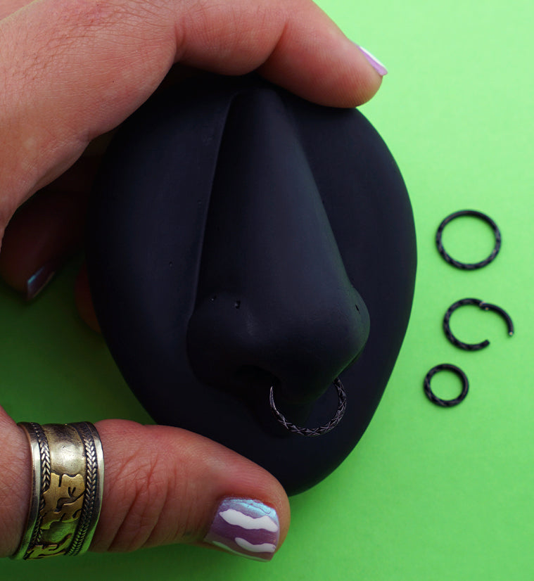 Hinged segment ring made from black pvd on 316L stainless steel with a hoop design that has a front-facing, faceted design along the bottom. Size is 16G with an inner diameter size of either 1/4" (6mm), 5/16" (8mm) or 3/8" (10mm). The hinged design makes this piece easy to insert and remove. Sold individually (1pc).