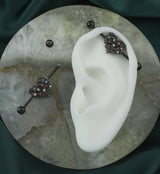 Dark industrial barbell with a filigree heart design that is filled with clear and red cz gems. The design measures at about 15mm x 16mm. The 14G straight barbell is constructed from black pvd on 316L stainless steel and two 5mm balls. Effortless external threading with silicone rings are attached behind the charm, making it adjustable. Sold individually (1pc). For healed piercings only.