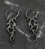 Hoop-style earrings with a dangling flame design attached. Hinged clasp is made from black pvd on 316L stainless steel. Size is 18G. Diameter is 1/2" (12mm). Total length is approximately 50mm. Width is 12mm. The hinged design is easy to open and close. Sold in pairs (2 pieces).