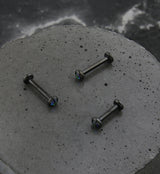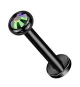 Classic and simple labret piece for your piercing! Internally threaded labret piece that has a black rainbow aurora, flat, bezel cz gem on top. Made from black pvd on ASTM F-136 titanium. Size is 16G. Available in two lengths: 1/4" (6mm) and 5/16" (8mm). Both have a 3mm sized gem top. Sold individually (1pc). For healed piercings.