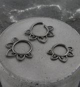 Hinged segment ring made from black pvd on ASTM F-136 titanium with a traced flower design with accented beads. Size is 16G. Choose your inner diameter size: 5/16" (8mm), 3/8" (10mm). The hinged design makes this piece easy to insert and remove. Sold individually (1pc).