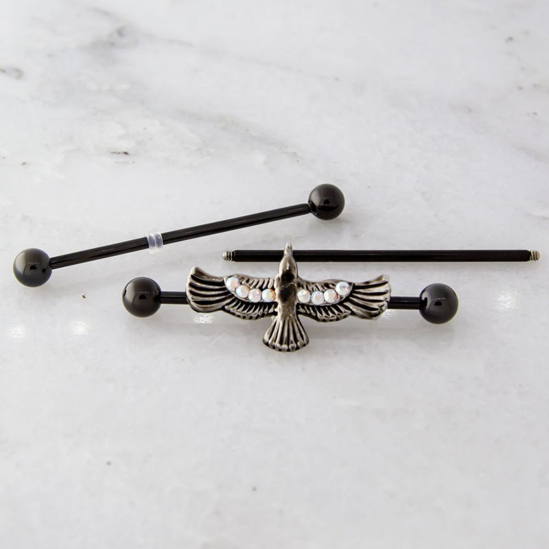 Dark flying raven industrial barbell! Complete with rainbow aurora cubic zirconia gems. The 14g straight barbell is constructed from black pvd on 316L stainless steel and two 5mm balls. Easy external threading. Sold individually. Intended for healed piercings only.