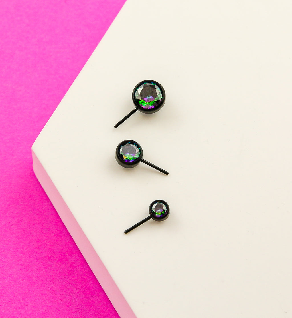 Dark, titanium threadless top which has a forward-facing, bezel-set, black rainbow aurora cz gem on top. Available in three gem sizes: 3mm, 4mm, and 5mm. This piece is made from black pvd on ASTM F-136 titanium and fits most threadless posts. Pin size is 25G. Sold individually (1pc - top only).