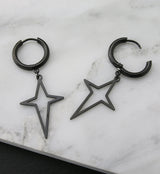 Trendy hoop-style earrings with a dangling four point star attached. Made from black pvd on 316 stainless steel. Size is 18G. Diameter is 1/2" (12mm). Total length is 48mm. The hinged design is easy to open and close. Sold in pairs (2 pieces). For healed piercings/lobes.
