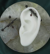 Gothic themed industrial barbell with a skeleton hand in between two roses that is holding a dangling, red heart cz gem. The design measures at about 14mm x 15mm. The 14G straight barbell is constructed from black pvd on 316L stainless steel and two 5mm balls. Easy external threading. Silicone rings are attached behind the charm, making it adjustable. Sold individually (1pc). For healed piercings only.