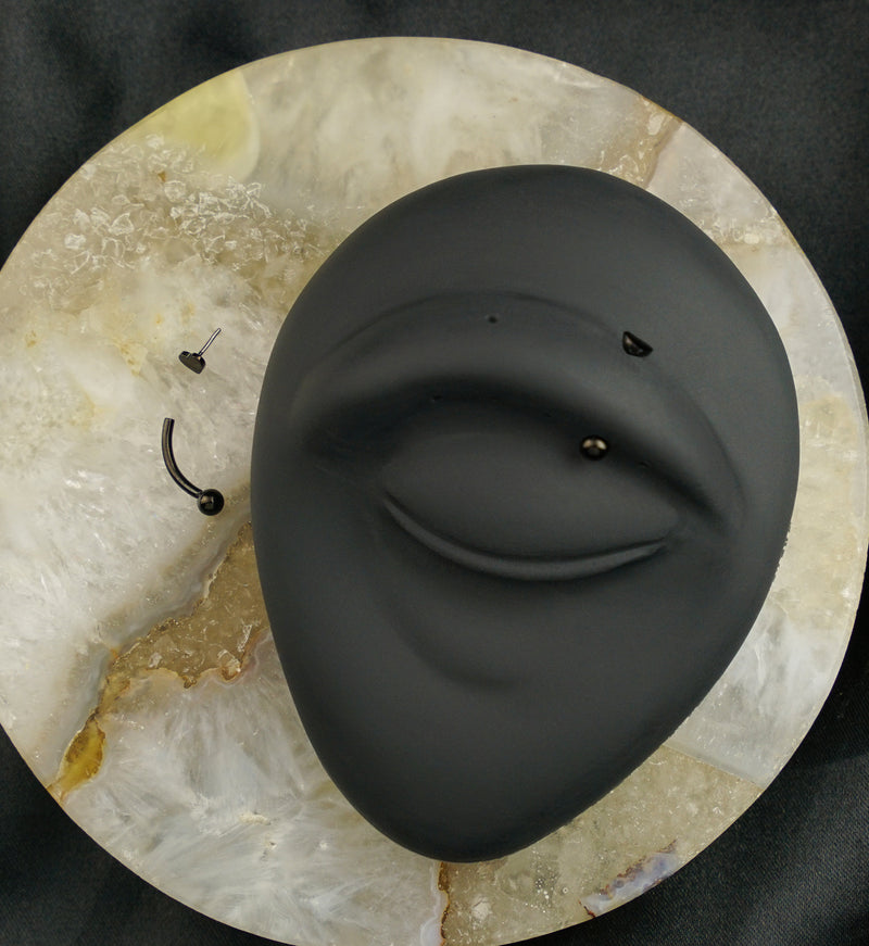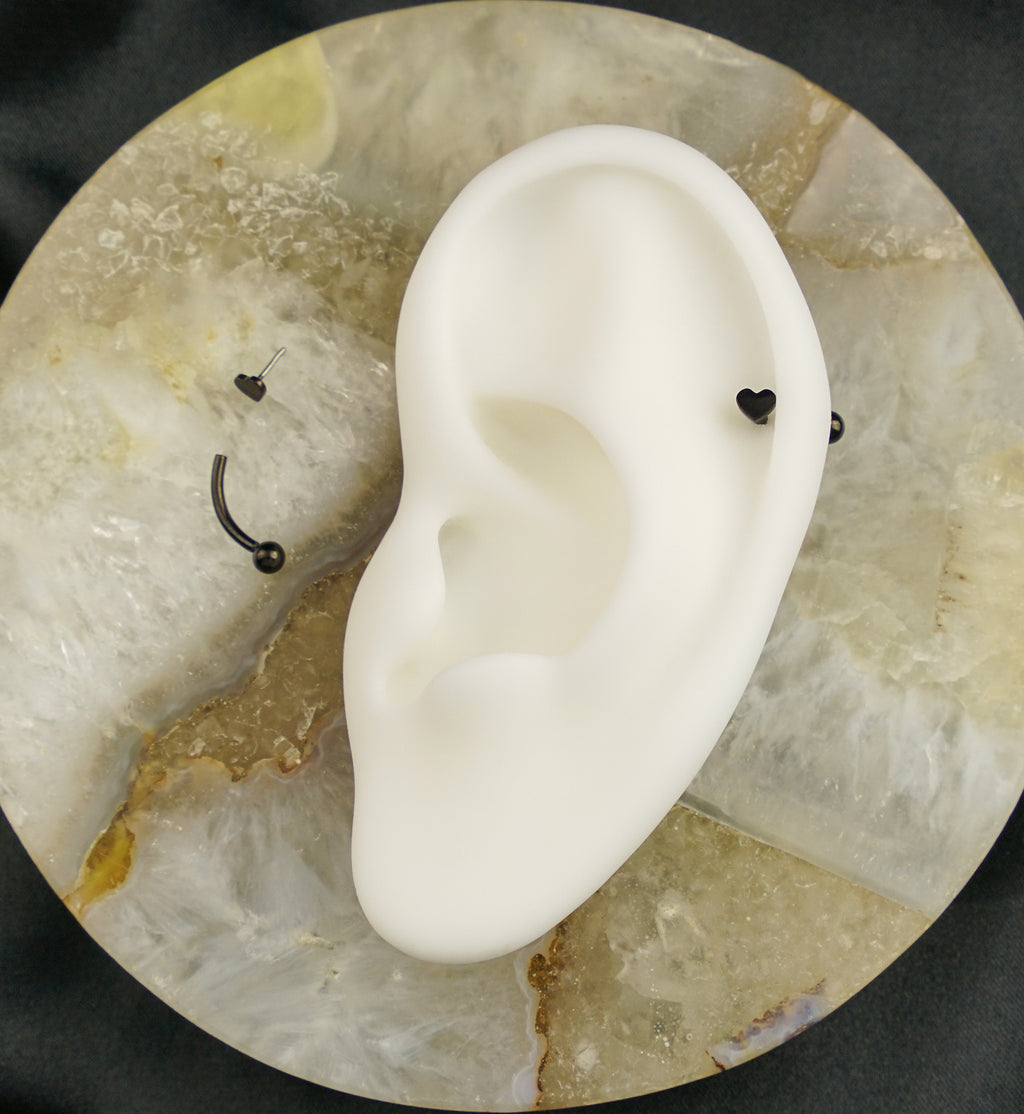 Curved barbells decorated with a cute, heart design on top. The top piece has a threadless design for easy insertion and take out and measures 4mm. Made from black pvd on ASTM F-136 titanium with an inner length of 5/16" (8mm) and a 16G size. Complete with a 3mm ball on the end. Sold individually. Dark piece for eyebrow or rook piercings!