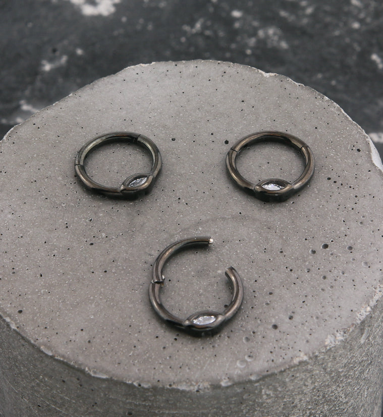 Black hinged segment ring made from black pvd on 316L stainless steel with a bezel-set, oval-shaped, clear cz gem on the front. Size is 16G. Inner diameter size: 5/16" (8mm). The hinged design makes this piece easy to insert and remove. Sold individually (1pc).