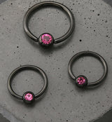 Add a little sparkle with our black pvd pink cz captive rings! The barbell is constructed from 316L stainless steel with titanium ion-plated black coating. Choose your gauge size: 16G. Inner diameter size: 3/8" (10mm). Sold individually (1pc), add more to your cart if you'd like more than one! For healed piercings.
