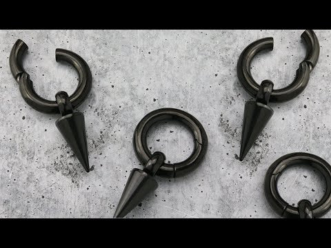 Dark hoop hinged ear weights with an attached pointed cone charms. Made from black pvd on 316L stainless steel with a magnetic hinged design. Height is 55mm, width is 30mm, weight is 26 grams each. 2G or bigger to wear. Sold in pairs (2pcs).