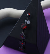 Black PVD on 316L stainless steel barbell with dual, bright red Swarovski cz gems attached to three dangling flowers with centered Swarovski cz gem. Size 14G with 3/8" (10mm) length. Externally threaded. Not intended for initial piercings.