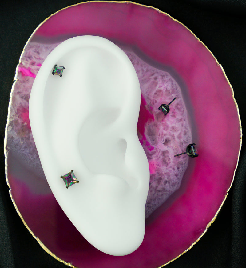 Threadless top that has a square-shaped, prong-set, black aurora cubic zirconia gem design. Made from black pvd on ASTM F-136 titanium. 25G pin. Fits most threadless posts. Choose your gem size from 3mm and 4mm. Sold individually (top piece only).