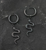 Hoop-style earrings with a dangling snake attached. Hinged clasp is made from black pvd on 316L stainless steel. Size is 18G. Diameter is 1/2" (12mm). Total length is approximately 50mm. The hinged design is easy to open and close. Sold in pairs (2 pieces).