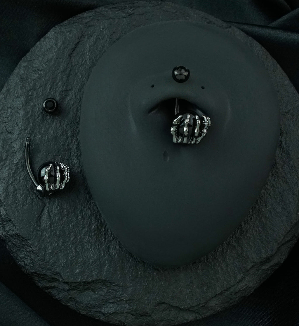 Unleash your dark side with our Black PVD Skeletal Palm Belly Button Ring. Made of 316L stainless steel, with a 14G size and 3/8" (10mm) barbell, it features a striking black onyx stone sphere and CZ gem for a unique twist. It has a mix of black pvd an hematite coating. Sold individually, this externally threaded ring is perfect for healed piercings.