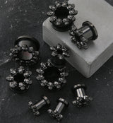 Screw back tunnels plugs with a circle of skull heads design around the front. Made from black pvd on 316L stainless steel. Available sizes: 2G (6mm), 0G (8mm), 00G (10mm), 7/16" (11mm), 1/2" (12mm), 9/16" (14mm), 5/8" (16mm). Full Length: 13mm X Wearable area: 8mm. Sold in pairs (2pcs).