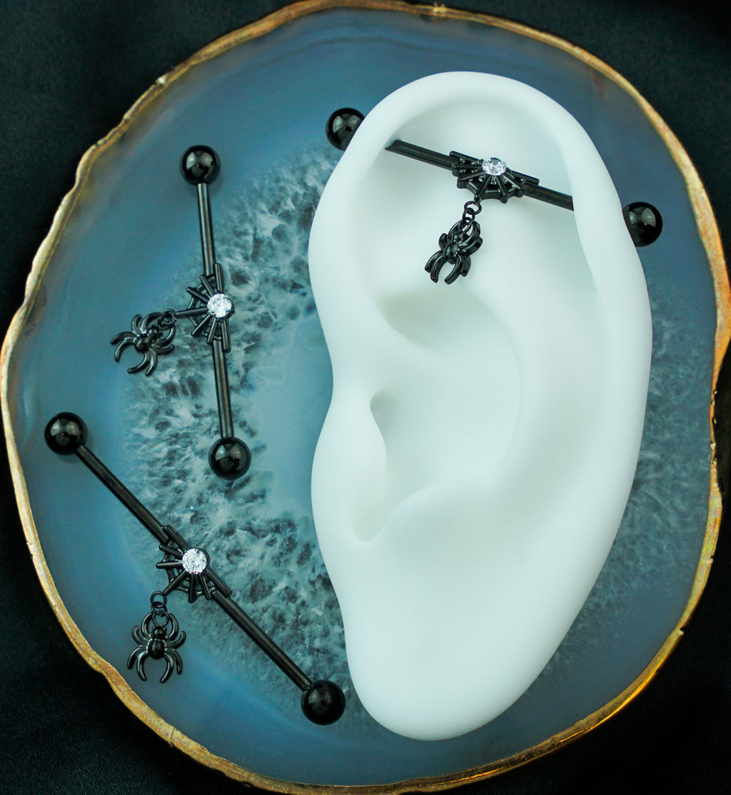 This 14g straight barbell is made from black pvd on ASTM F-136 titanium with an spiderweb design that has an accented, centered, clear cz gem. Attached is a dangling spider design! Choose your size from 1 & 1/4 (32mm) or 1 & ½”(38mm). The balls on each end are internally threaded and measure 5mm each. Sold individually. For healed piercings.