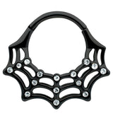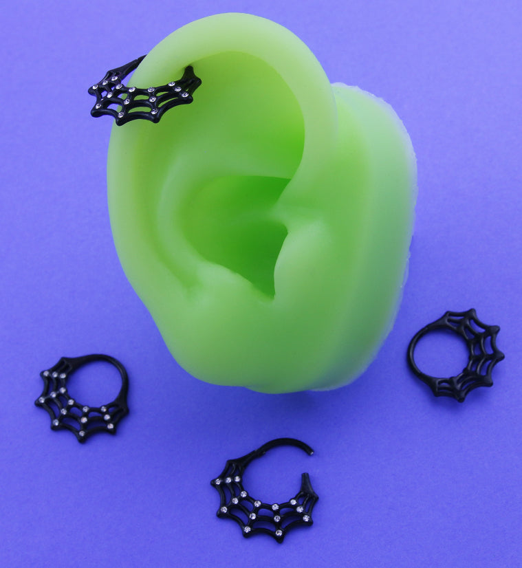 Cool segment ring made from black pvd on 316L stainless steel with a hoop shape and a spiderweb design that has accented, clear Swarovski cz gems throughout. Size is 16G with an inner diameter size of 3/8" (10mm). The hinged design makes this option easy to put in and take out. Sold individually (1pc).