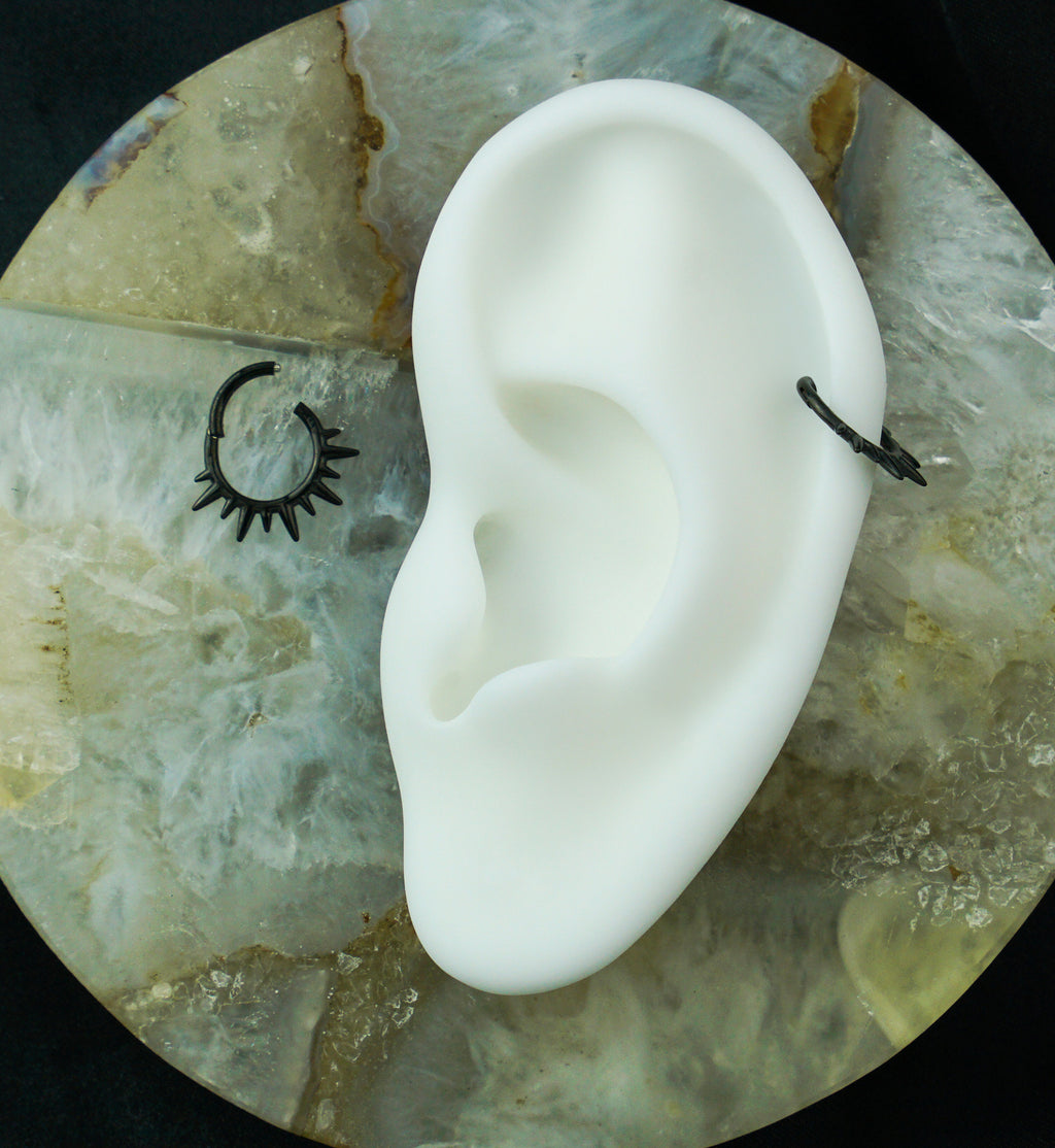 This edgy Black PVD Spike Rays Stainless Steel Hinged Segment Ring is perfect for healed piercings. Its hinged segment allows for easy opening and closing, making it an effortless piece of jewelry to have in your collection. Sold individually in size 16G with an inner diameter of 5/16" (8mm), it's great for septum or cartilage piercings.
