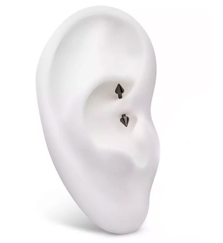 Internally threaded curved barbell made from black PVD on ASTM F-136 titanium and 2 spike ends. Size 16G with a length of 5/16" (8mm) or 3/8" (10mm). Spike end size is 3mm. Both ends are internally threaded and removable. Sold individually. For healed piercings.